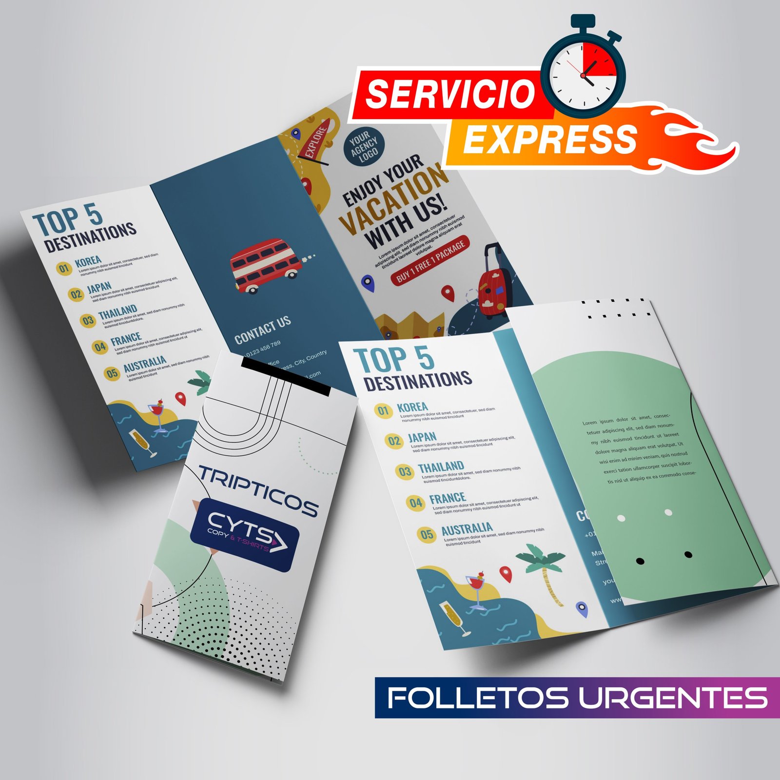 - Folletos Express en 24 h, ¡¡Incluso en el mismo dia!! Dípticos A5, A4 y A3 – Trípticos A4. Desde 50 unidades. Brillo o mate.