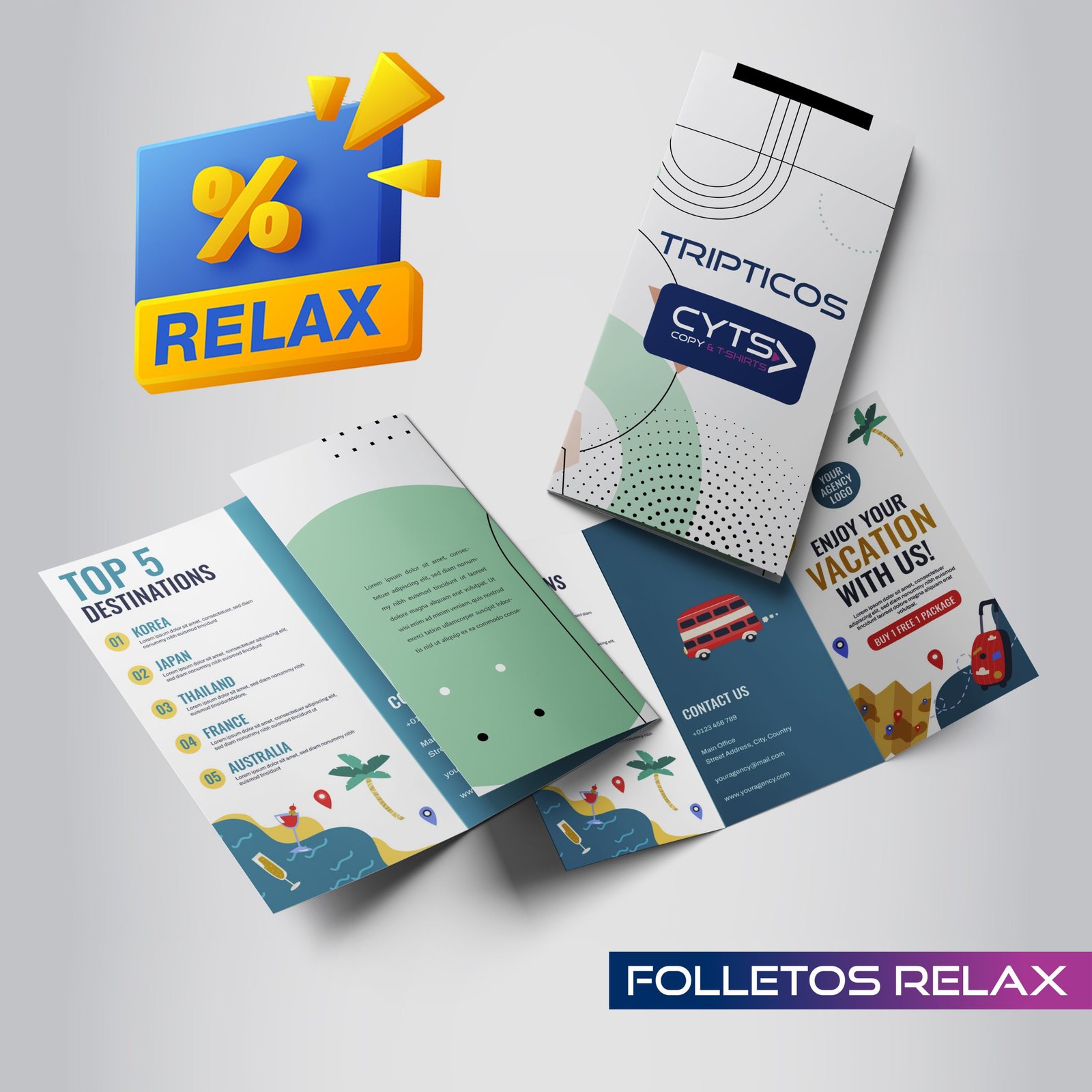 - Folletos Relax: 1 semana. A partir de 1000 unidades. Papel semimate de 135gr, 170gr y 250gr.