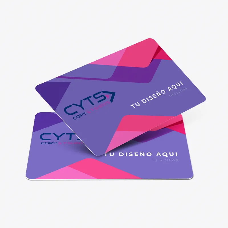 Fabricadas en material plástico rígido de alta calidad, las tarjetas PVC destacan por su gran durabilidad frente al uso diario, la humedad, los roces o el paso del tiempo. No se doblan, no se deterioran con facilidad y mantienen la impresión intacta durante años, lo que las convierte en la opción ideal para tarjetas de socio, tarjetas de fidelización, identificaciones corporativas, acreditaciones, carnés, tarjetas regalo o promociones comerciales.